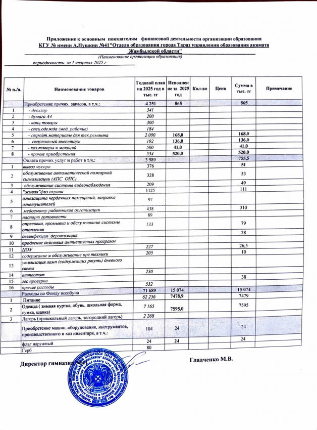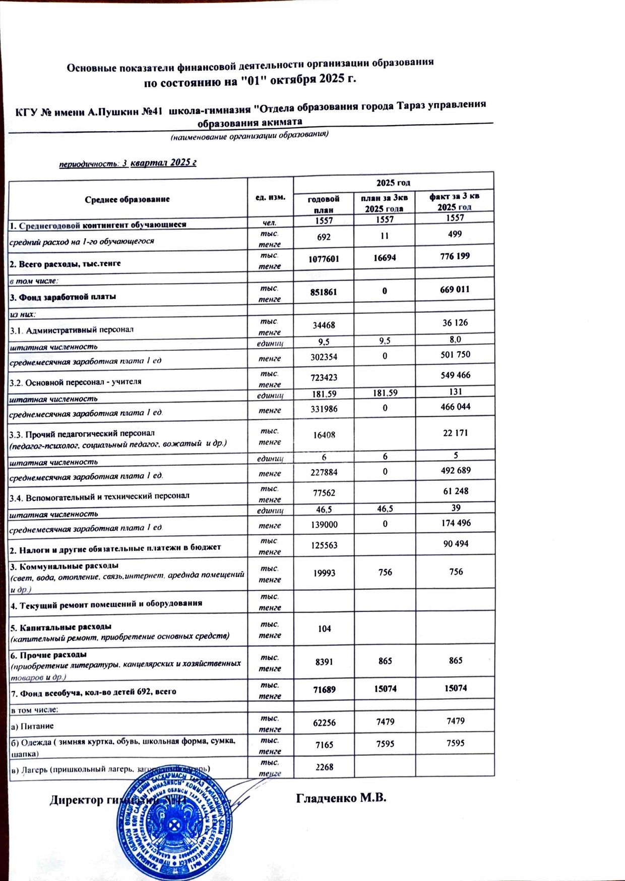 Основные показатели финансовой деятельности » Коммунальное государственное учреждение "Гимназия №41 имени А.С. Пушкина" отдела образования города Тараз Жамбылской области