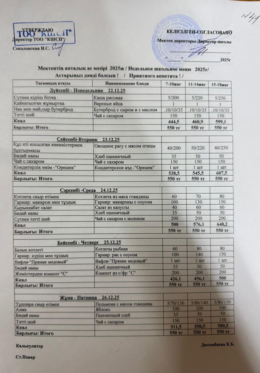 Ас мәзірі 22.12.2025-26.12.2025 » Коммунальное государственное учреждение "Гимназия №41 имени А.С. Пушкина" отдела образования города Тараз Жамбылской области